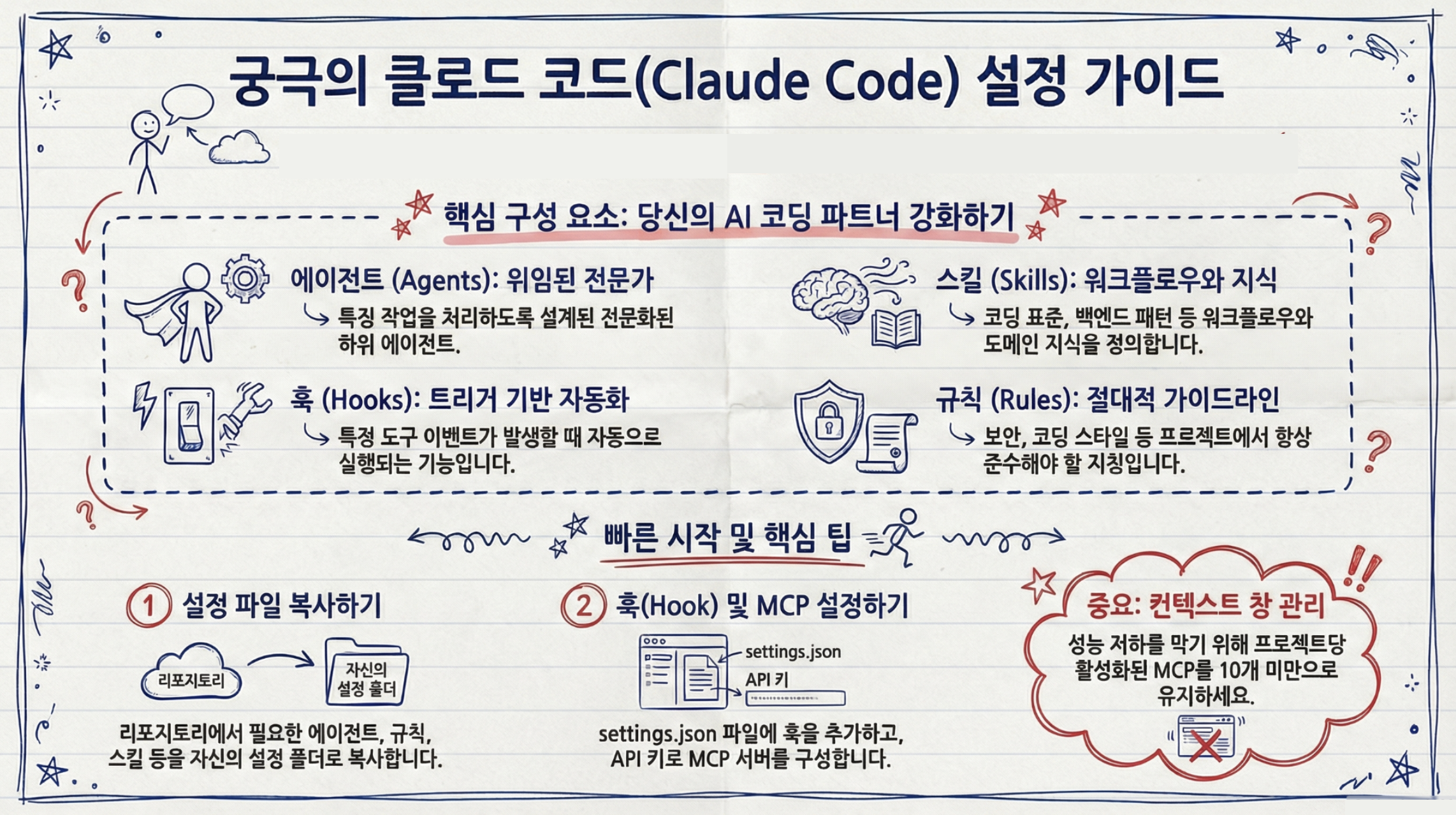 에이전트, 스킬, 훅, 커맨드, 규칙, MCP 설정을 체계적으로 정리한 완벽한 한글 가이드